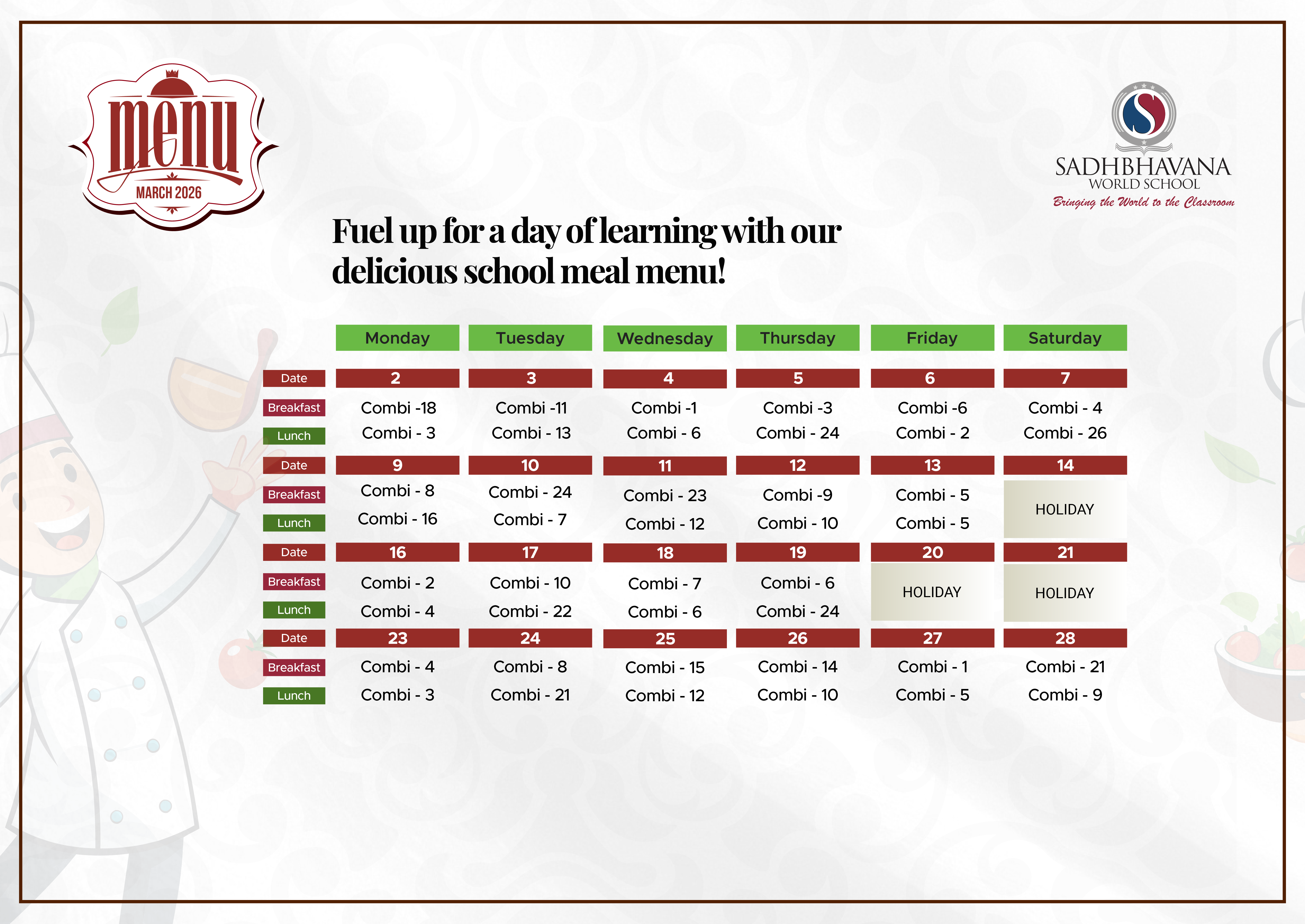 The breakfast and lunch served at Sadhbhavana constitute a balanced diet that meets the children’s daily needs for calories and key nutrients. At the same time we also make the whole experience fun and educational for them by providing a variety of meals from different parts of the country and the world. Given below is our meal menu for the current month.